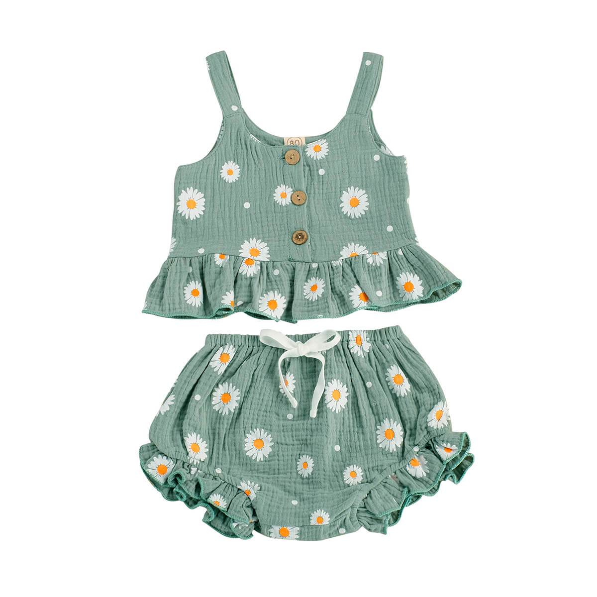 This adorable toddler girl outfit includes a ruffled top with a charming daisy print and matching shorts that are perfect for warmer weather. The soft and comfortable fabric will keep your little one feeling comfortable all day long, while the elastic waistband ensures a secure and snug fit. Whether worn for a day of play or a family outing, this set is sure to keep your little one looking stylish and feeling happy.