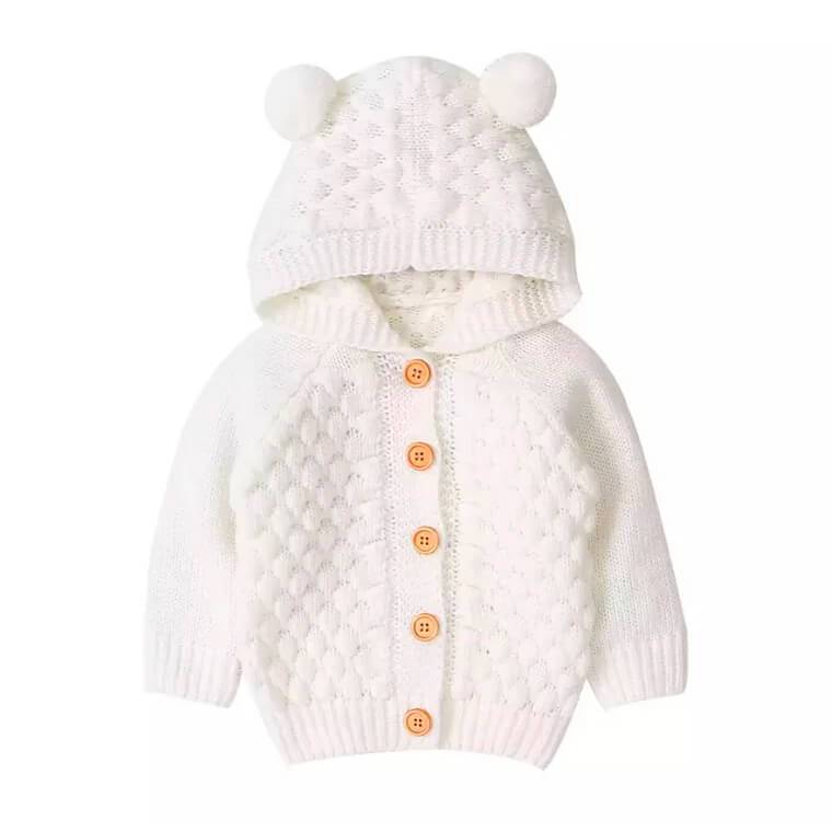 This adorable unisex baby hooded cardigan is the perfect addition to any little one's wardrobe. Made from soft and cozy knitted fabric, this cardigan features cute bear ears on the hood, adding an extra touch of cuteness. The solid color makes it easy to pair with any outfit, while the front button closure ensures it stays securely fastened.