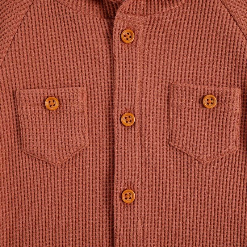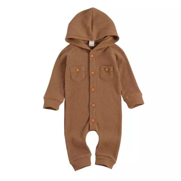 This unisex baby long sleeve solid waffle hooded jumpsuit is a cozy and stylish outfit. Made with high-quality materials, it is durable and comfortable for maximum comfort. The hooded design adds warmth and comfort to the outfit, while the front pockets and buttons provide convenience and style. The waffle pattern adds texture and style to the outfit, making it perfect for any occasion.