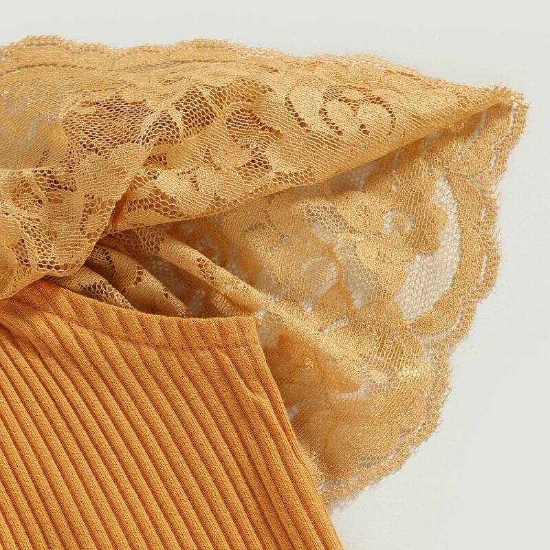 The solid ribbed bodysuit with delicate lace details adds a touch of elegance to the ensemble, while the flared jeans create a fun and playful look. The versatile color palette allows for endless pairing options, making this outfit perfect for any occasion. Whether your little one is crawling around the house or exploring the great outdoors, she'll be both stylish and cozy.