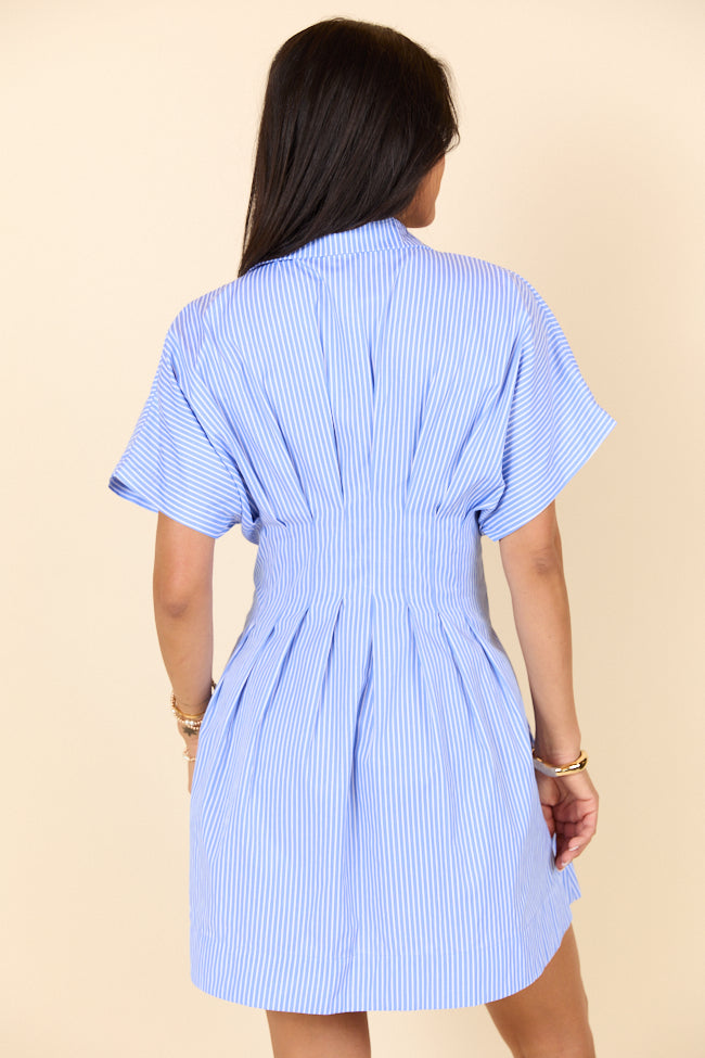 - Short sleeves, collared style, functional button up closure cinched waist, functional pockets