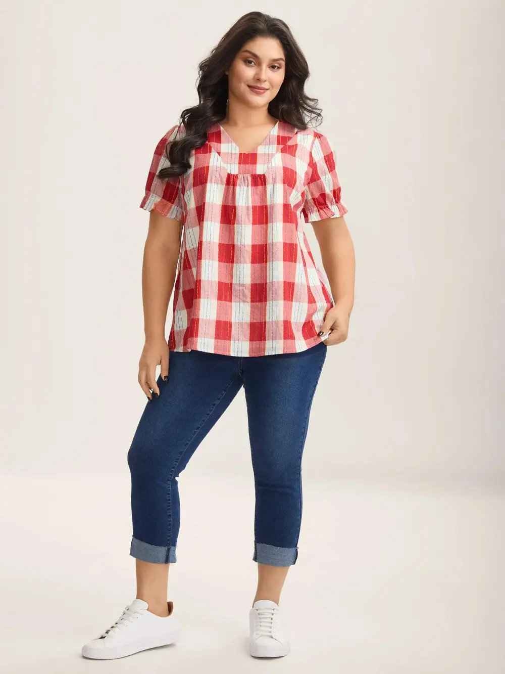Cotton Plaid Print V-Neck Puffy Sleeve Blouse