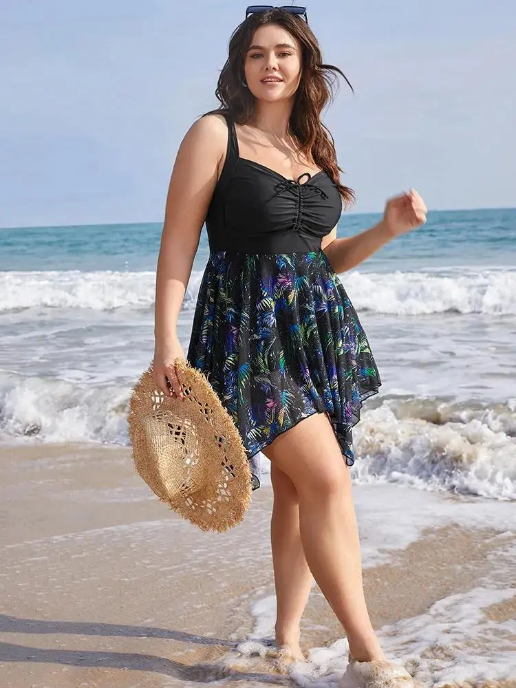 Tropical Ruched Ties Hanky Hem Crisscross Swim Dress