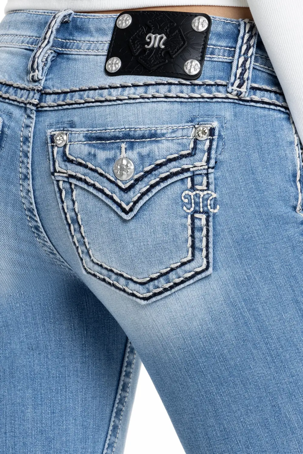 - Embroidered white Miss Me logo on back and faux flap pockets