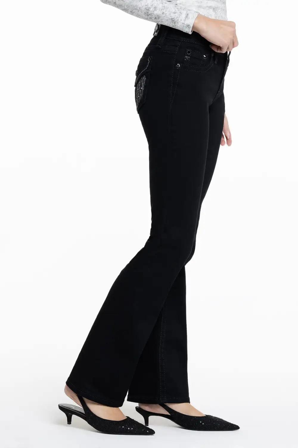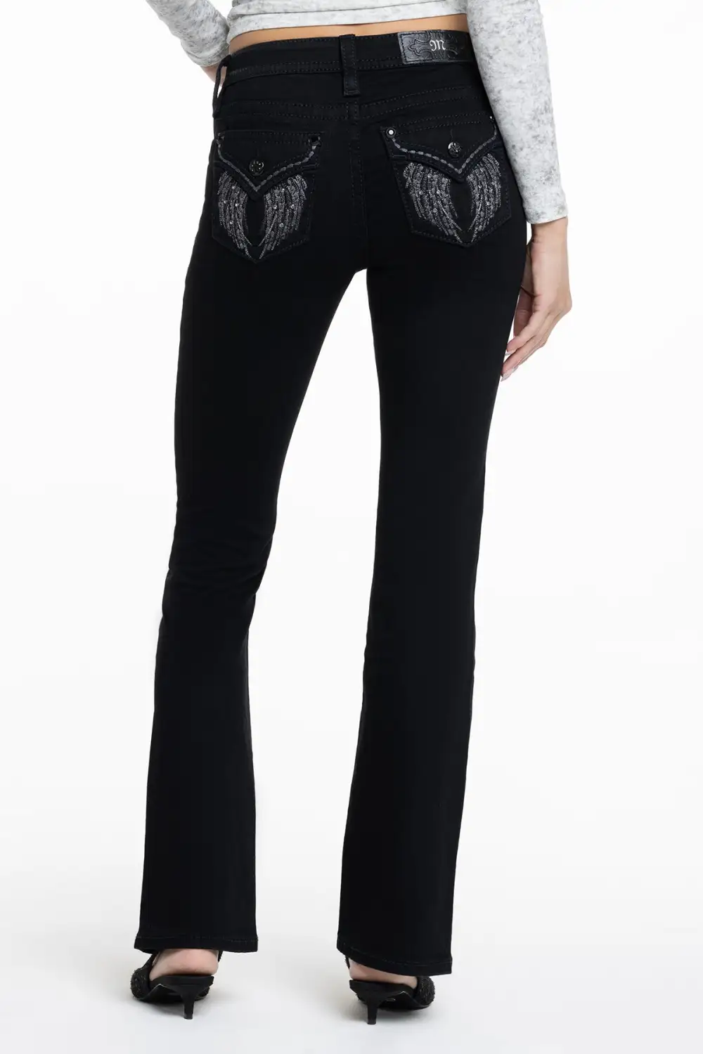 Mid-rise, black bootcut jeans