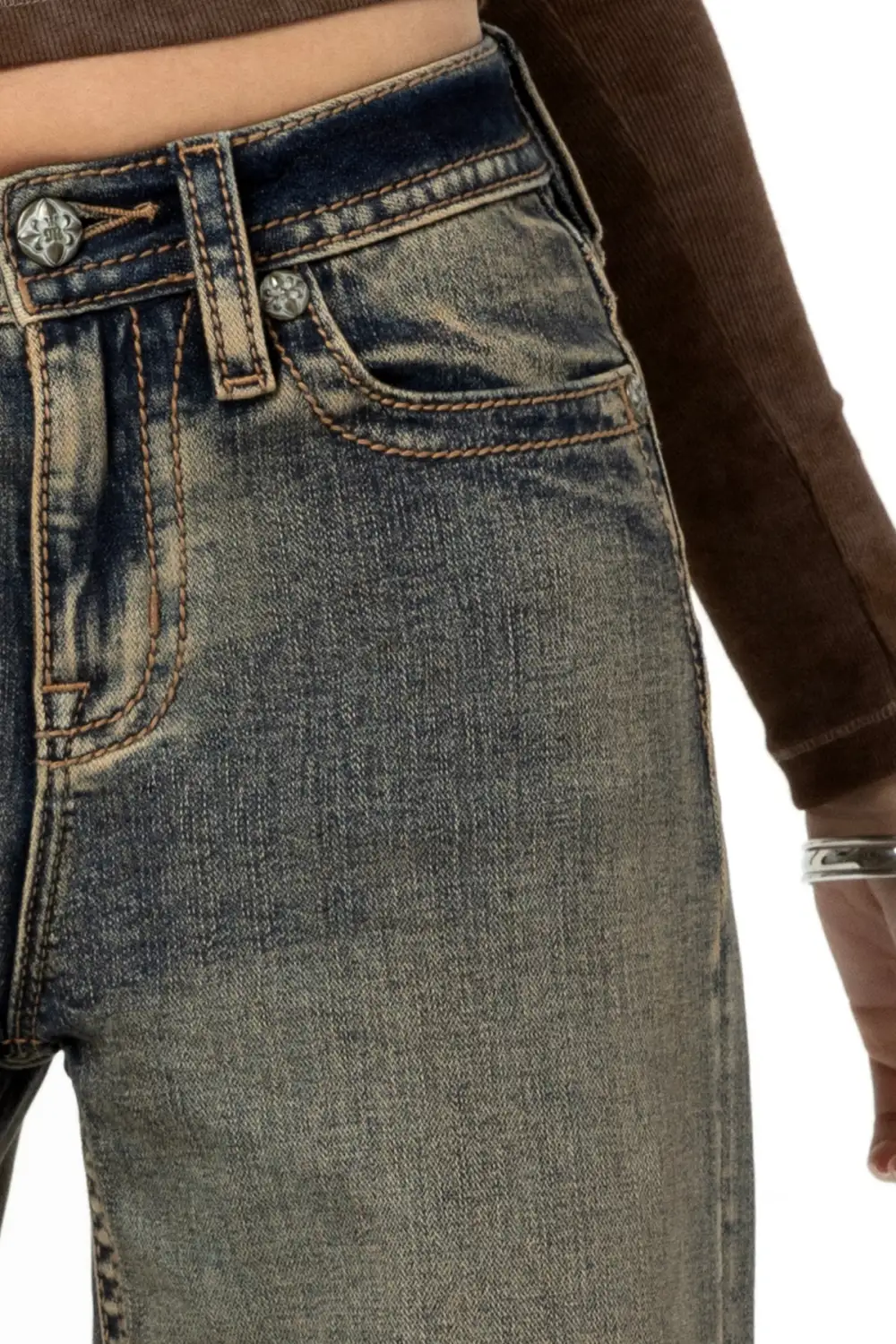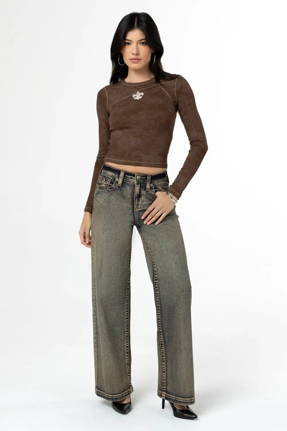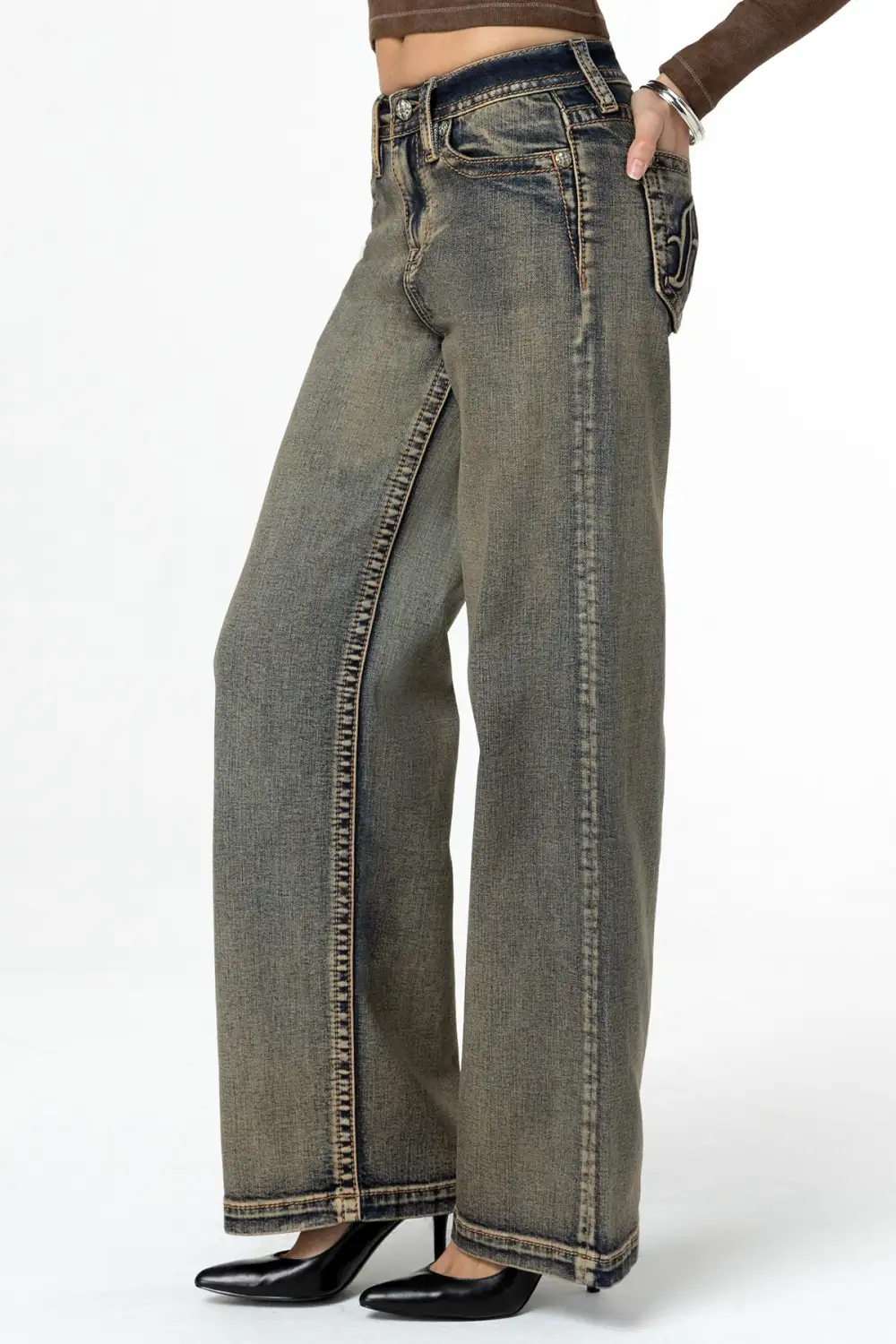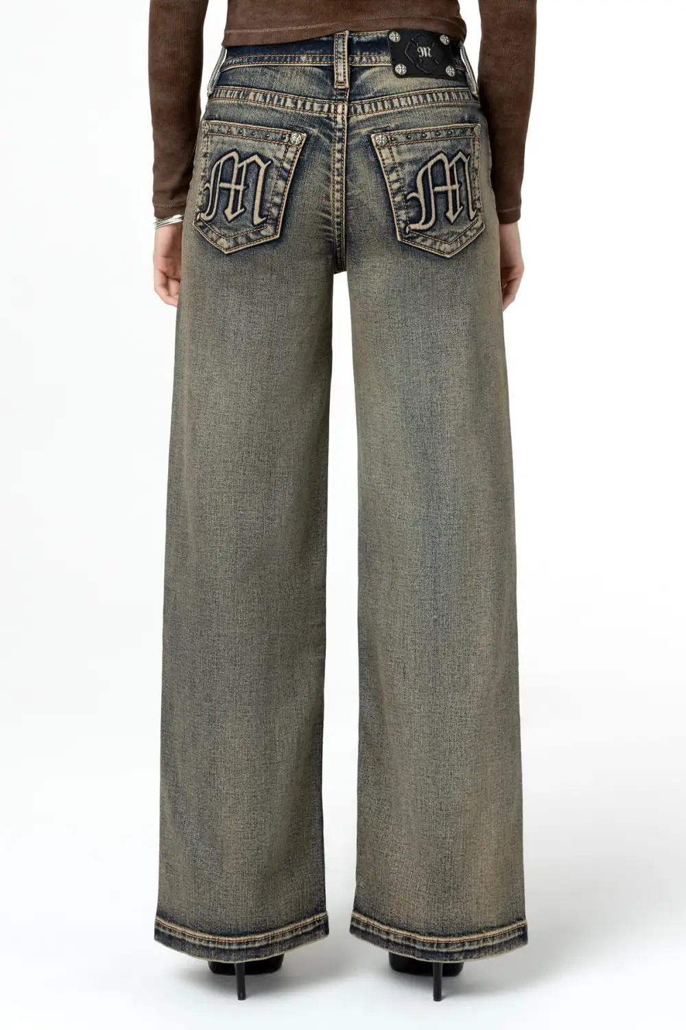 - Black embroidered, raised denim Miss Me logo design